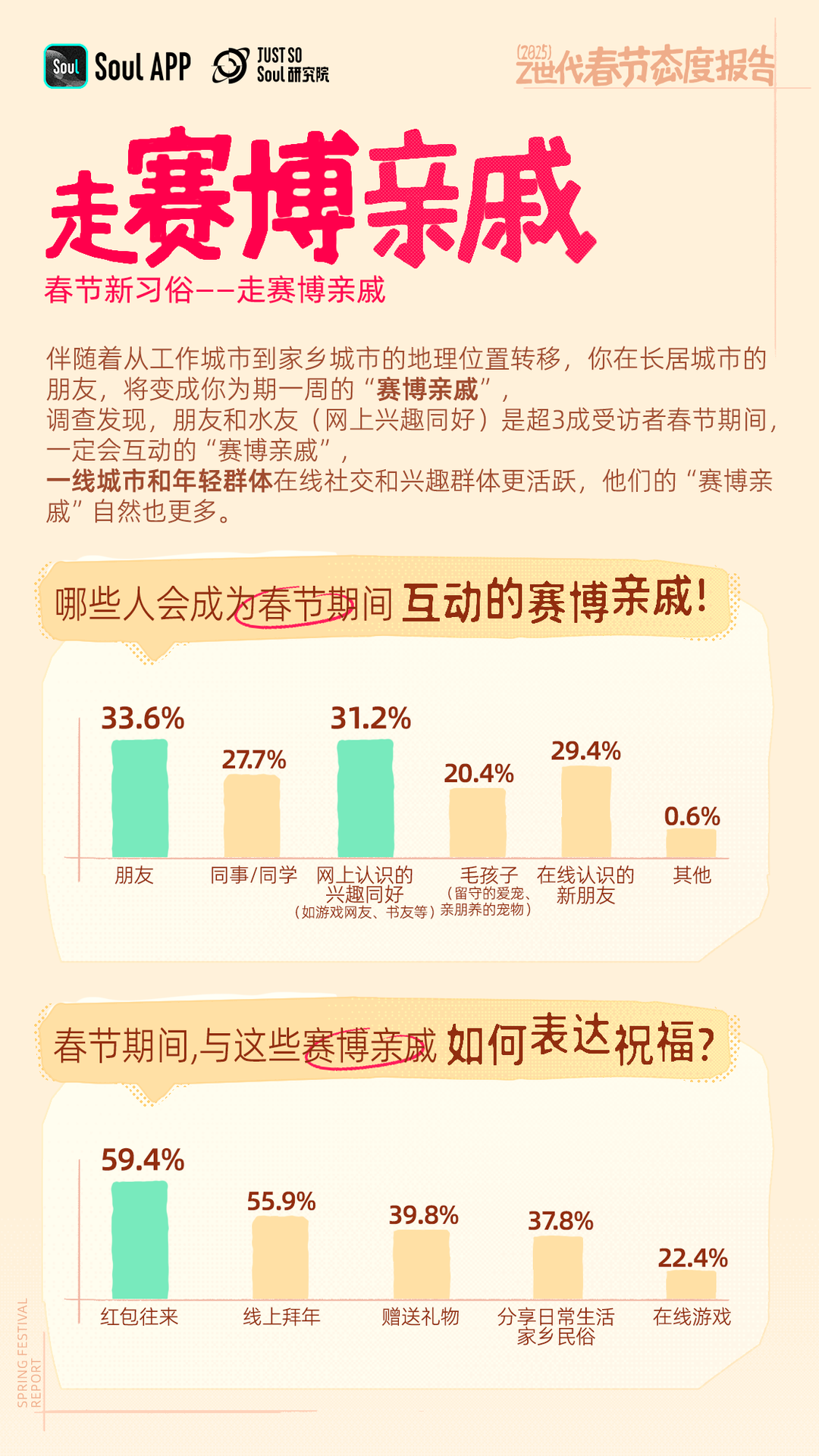 报告中提出了一个有趣的概念——“赛博亲戚”。随着年轻人从工作城市回到家乡城市,他们在长居城市的朋友和兴趣同好变成了春节期间的“赛博亲戚”。这些“赛博亲戚”成为了年轻人春节期间互动的重要对象,他们通过红包往来和线上拜年等方式维系关系,这种传统民俗的线上应用也正契合了“赛博亲戚”的氛围感。