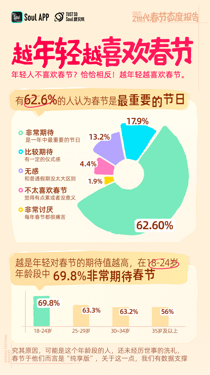 2025年1月,Soul App旗下Just So Soul研究院发布《2025 Z世代春节态度报告》,通过对5695位用户的调研,深入剖析了如今年轻人对春节的独特态度和行为习惯,揭示他们在传统节日中展现出的新活力与新趋势。