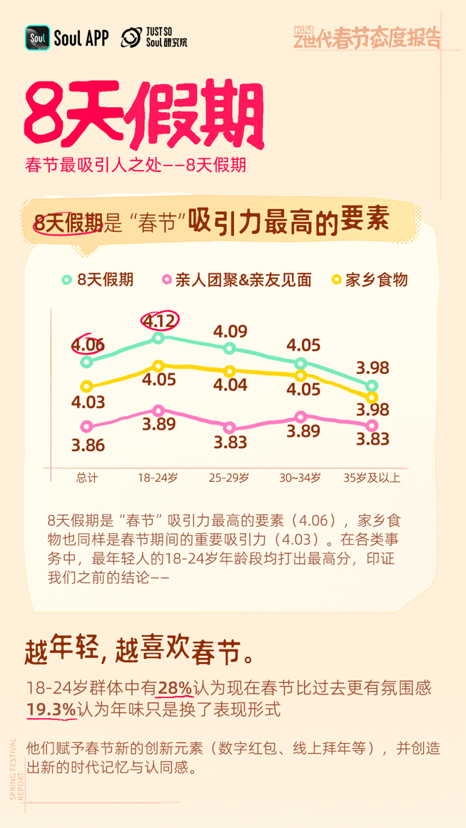 春节是一个与家人团聚、与朋友相聚的时刻,它让人们在忙碌的生活中停下脚步,享受亲情和友情的温暖。对于尚未经历太多社会压力的18-24岁年轻人来说,春节更像是一场“纯享版”的假期,他们可以暂时抛开学业和工作的压力,尽情享受节日的欢乐。