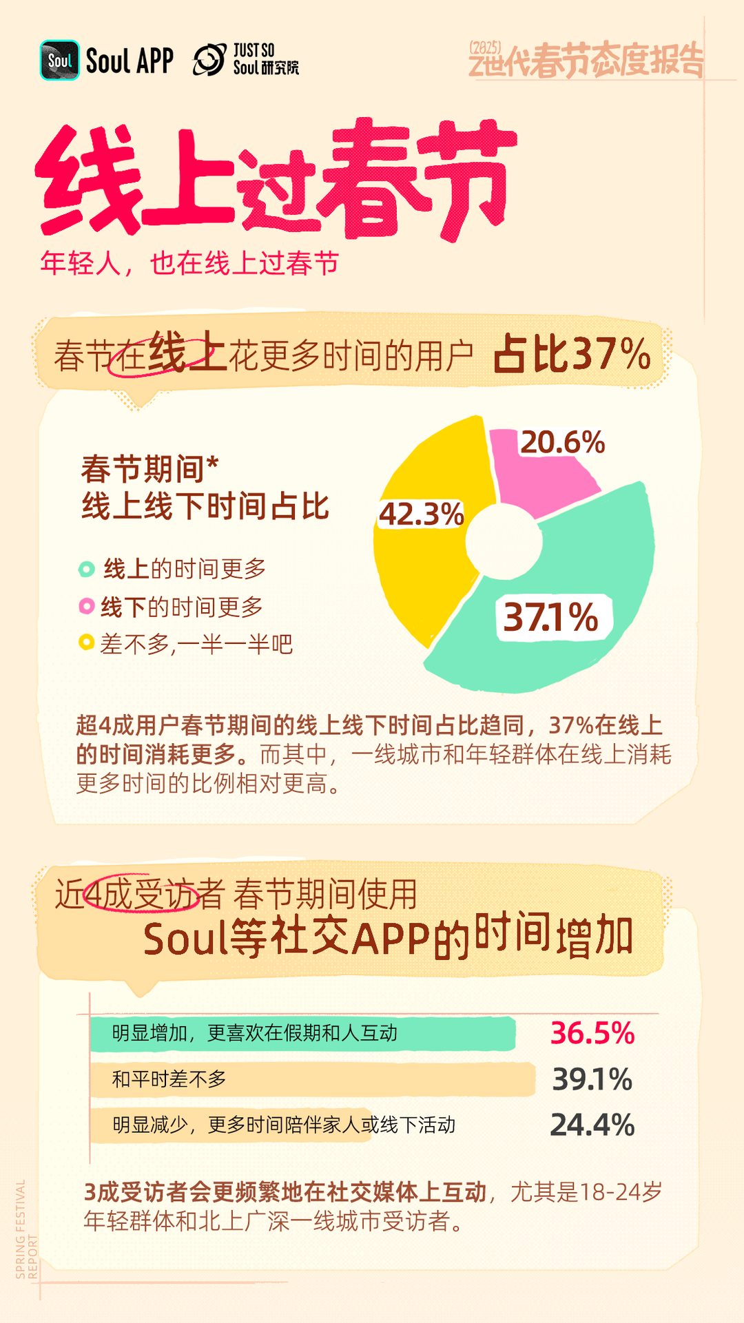 春节期间,超4成用户的线上线下时间占比趋同,37%的用户在线上的时间消耗更多。尤其是在一线城市和年轻群体中,这一比例更高。因此,线上互动也成为春节社交的重要组成部分,近4成受访者在春节期间使用Soul等社交App的时间明显增加,3成受访者会更频繁地在社交媒体上互动。这种线上社交行为不仅让年轻人能够与远方的亲朋好友保持联系,还能让他们在春节期间结交新的朋友,拓展社交圈子。通过线上互动,年轻人可以分享自己的春节经历、交流节日感受,甚至组织线上活动,让春节的欢乐氛围更加浓厚。
