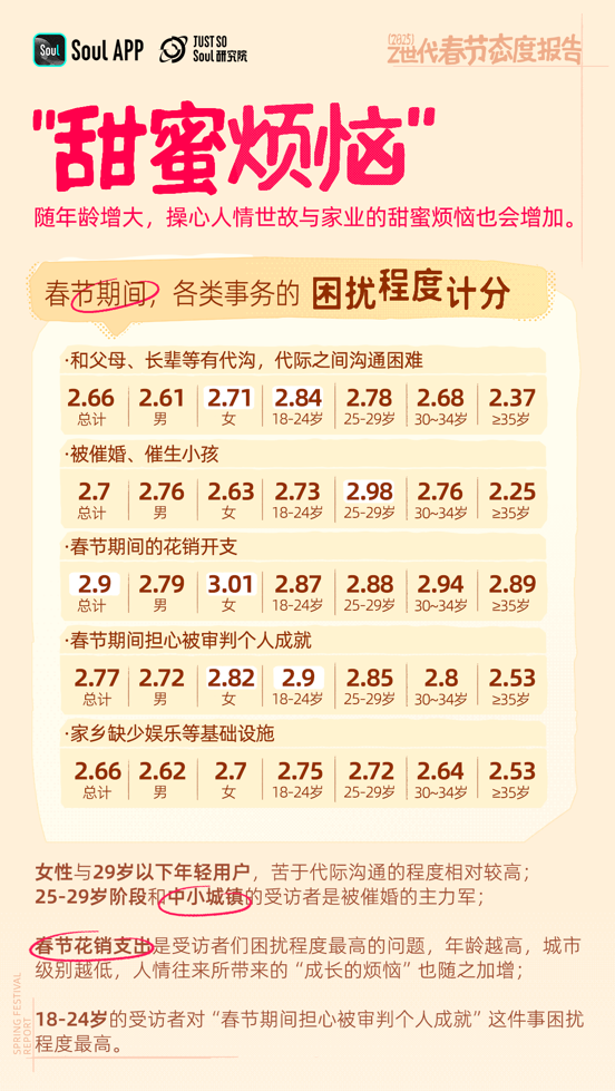 催婚问题也是春节期间年轻人面临的一大困扰。报告发现,25-29岁年龄段以及中小城镇的受访者是被催婚的“主力军”。在传统观念中,春节是一个家庭团聚的时刻,长辈们往往会在这个时候对年轻人的婚姻问题进行“审视”和“督促”。这种催婚行为虽然源于长辈对年轻人的关心,但对于年轻人来说,却可能带来一定的心理压力。